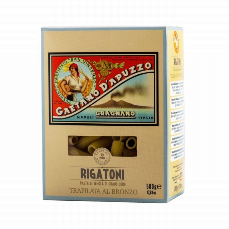 Makaron Rigatoni Gaetano D’Apuzzo to tradycyjny włoski makaron wykonany z najwyższej jakości semoliny z pszenicy durum, zgodnie z rzemieślniczymi metodami produkcji. Jego charakterystyczna, duża rurkowata forma oraz rowkowana powierzchnia sprawiają, że idealnie chłonie sosy, zapewniając doskonałą harmonię smaku w każdym kęsie.